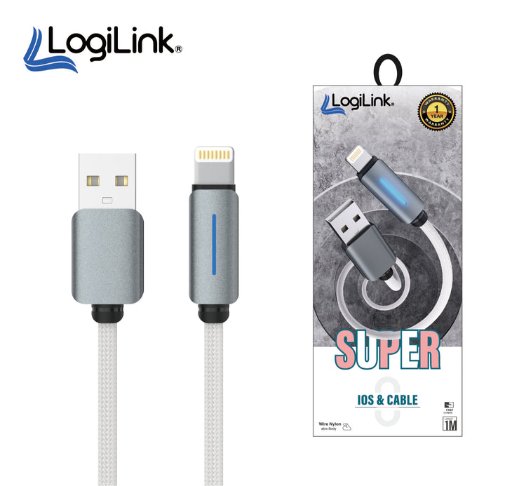 LOGILINK USB TO LIGHTNING NYLON FAST CHARGING DATA CABLE WITH LIGHT 1M (1 YEAR WARRANTY) WHITE