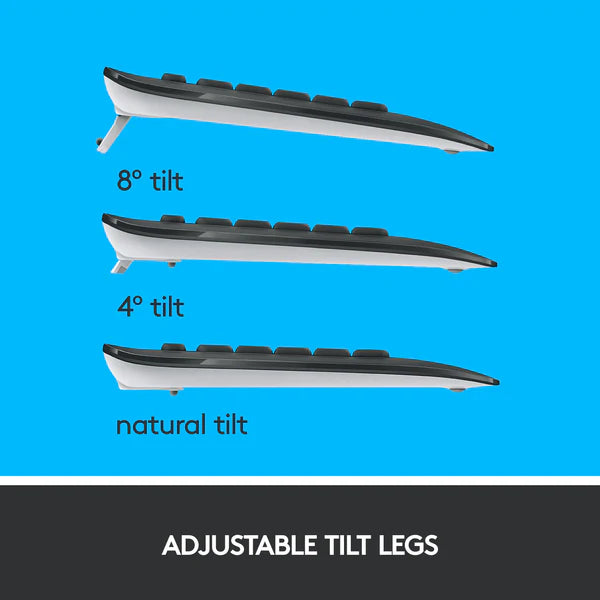 The keys are optimized for improved accuracy and reduced noise, while the familiar layout ensures your fingers feel instantly at home. Adjustable tilt legs and a built-in palm rest keep you comfortable during long typing sessions.